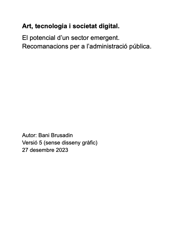 In 2023 I was commissioned a report by the Office of Innovation and Visual Arts of the Institut de Cultura de Barcelona (ICUB), culture department of Barcelona's City Council. In this operative document I explained why the narrative about art, technology and society should be partly redefined and suggested a few possible interventions in support of, among other things, cultural prototypes and scalable cooperation among existing agents.